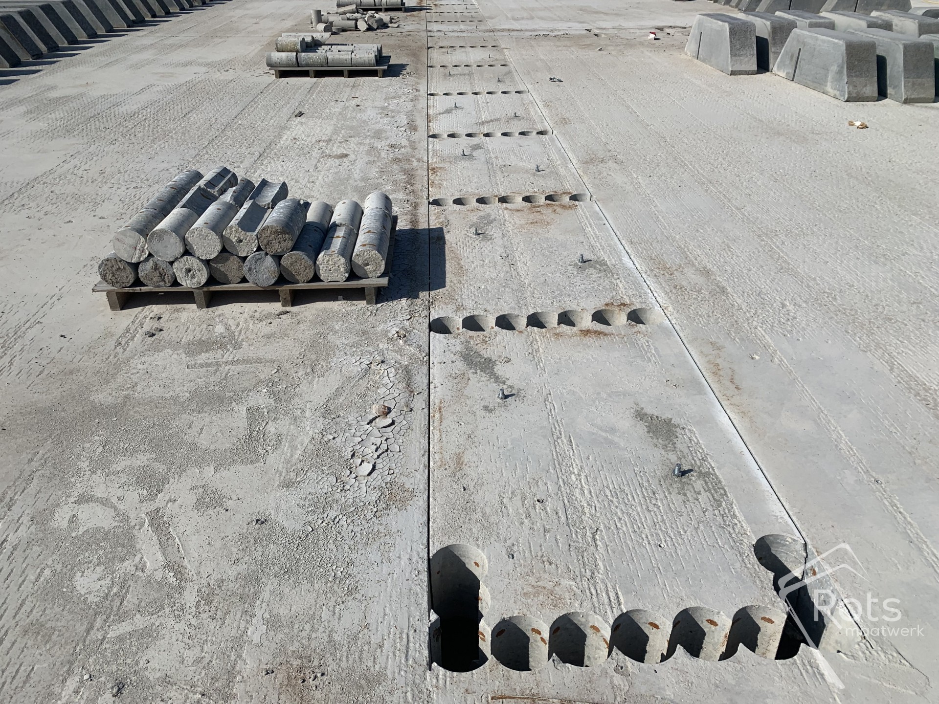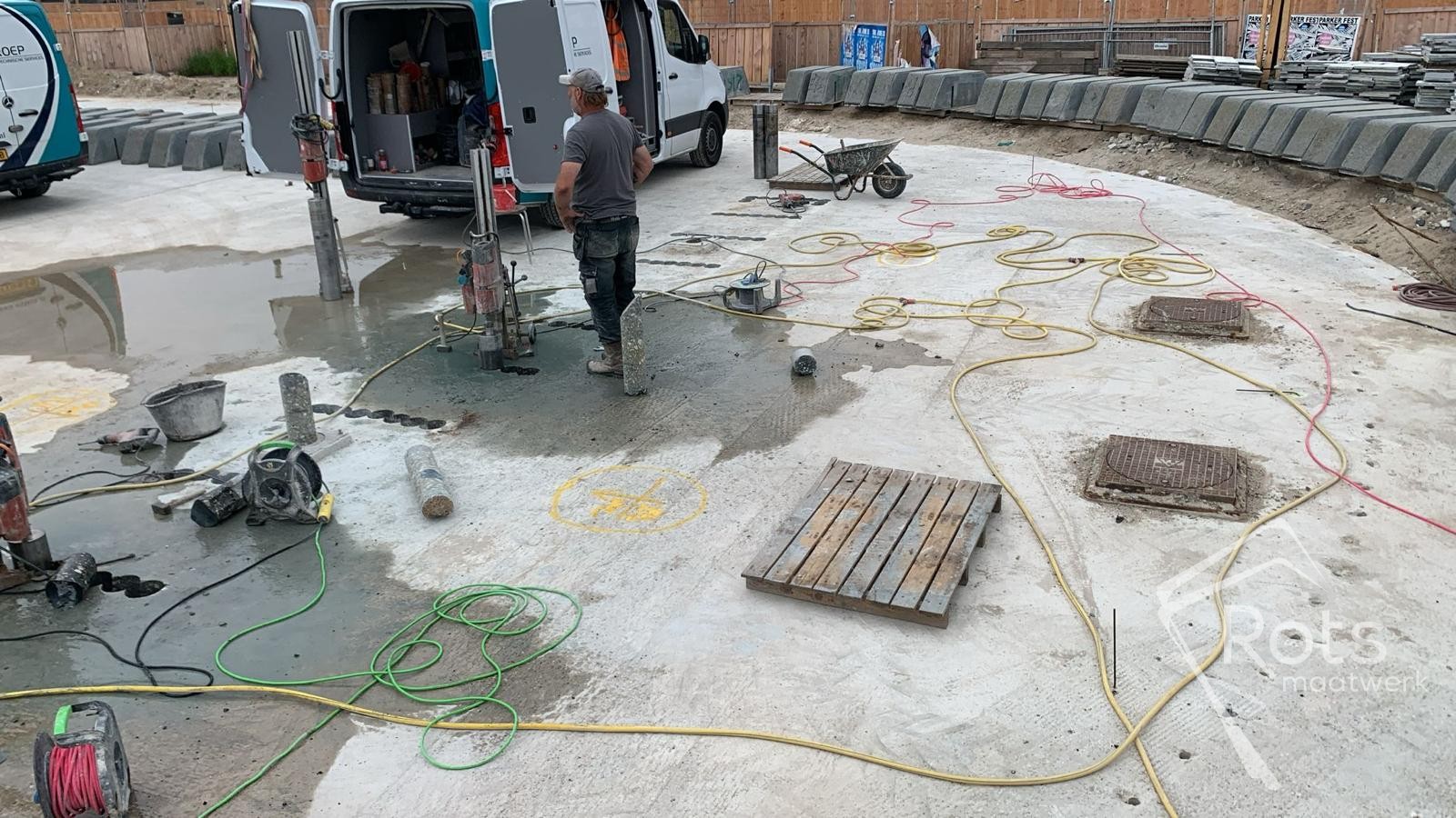 De betonnen fundatie is plaatselijk opgezaagd en volledig hersteld om nieuwe leidingen aan te brengen.